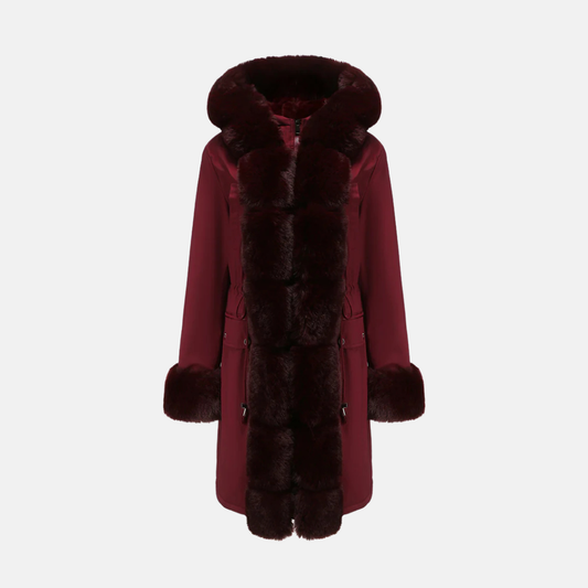Women's Long Coat - Woven Fabric - Fur Hood - Straight Cut