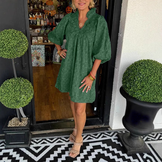 Women's short dress – Flowing flared cut – Bohemian embroidery – Balloon sleeves