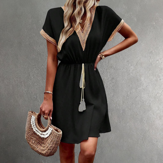 Women's short dress – V-neck – Elastic waist – Lace