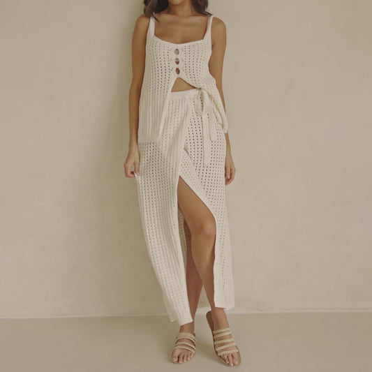 Women's Two-Piece Set – Buttoned Knit Crop Top – Adjustable Long Slit Skirt