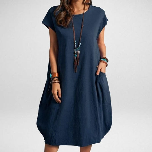 Women's long dress – Loose fit – Breathable fabric – Short sleeves with pockets