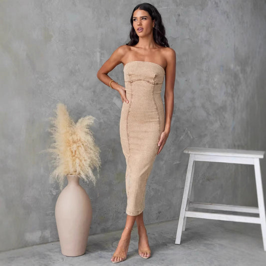Women's midi dress – Fitted cut – Strapless – Structured couture details
