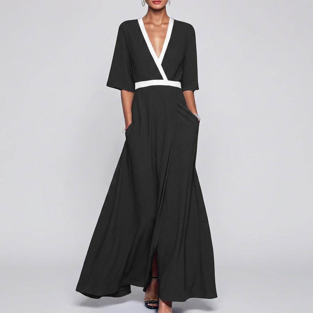 - Style Type: Maxi Dress, Wrap Design, White Trim, Pockets, Front Slit