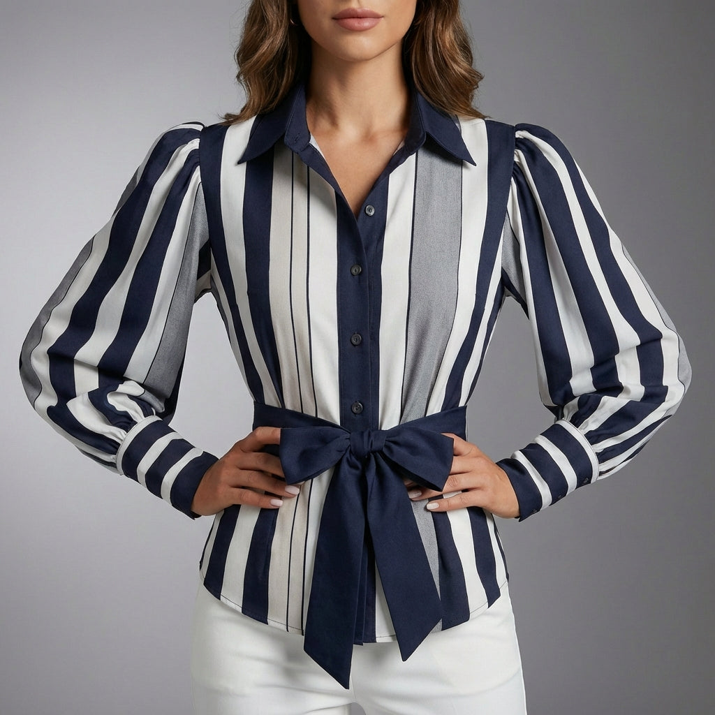Discover the perfect blend of style and comfort with this sophisticated shirt designed for the modern woman. Featuring a chic striped pattern and dramatic balloon sleeves, this piece will enhance your wardrobe while providing optimal comfort for any occasion.