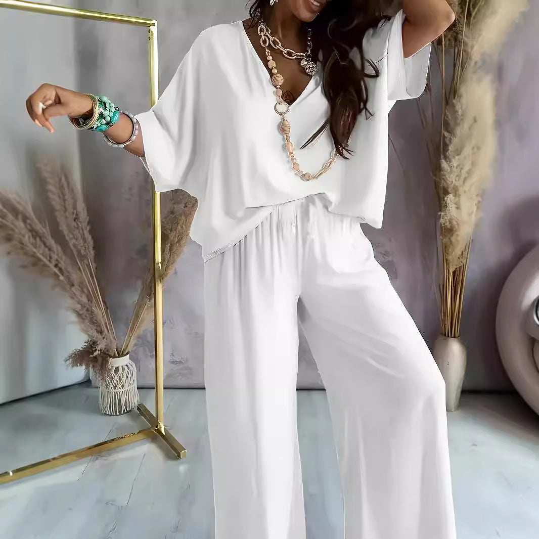 Women's Two-Piece Set – Breathable Fabric – Loose Fit – V-Neck Top – Wide-Leg Pants