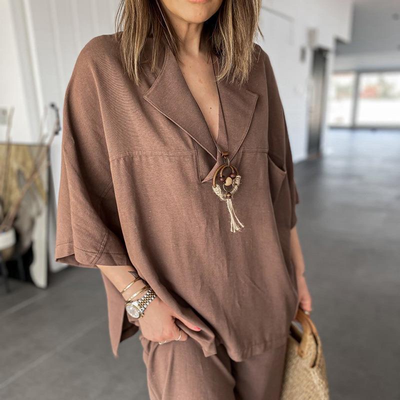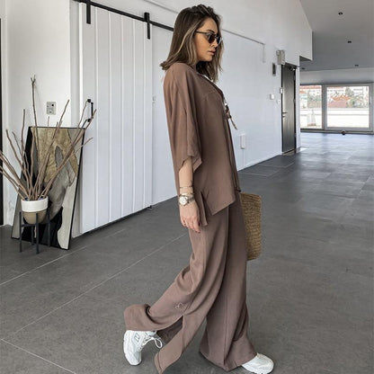 Women's Two-Piece Set – Breathable Fabric – Loose Fit – V-Neck Top – High-Waist Wide-Leg Pants
