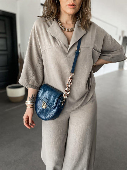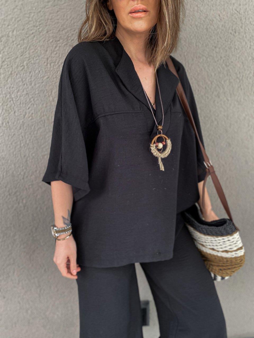- Design : Loose two-piece set, V-neck top, High-waisted wide-leg pants