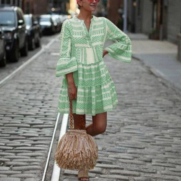 Women's dress A-line – Breathable fabric – Flared sleeves – V-neck – Ruffled skirt