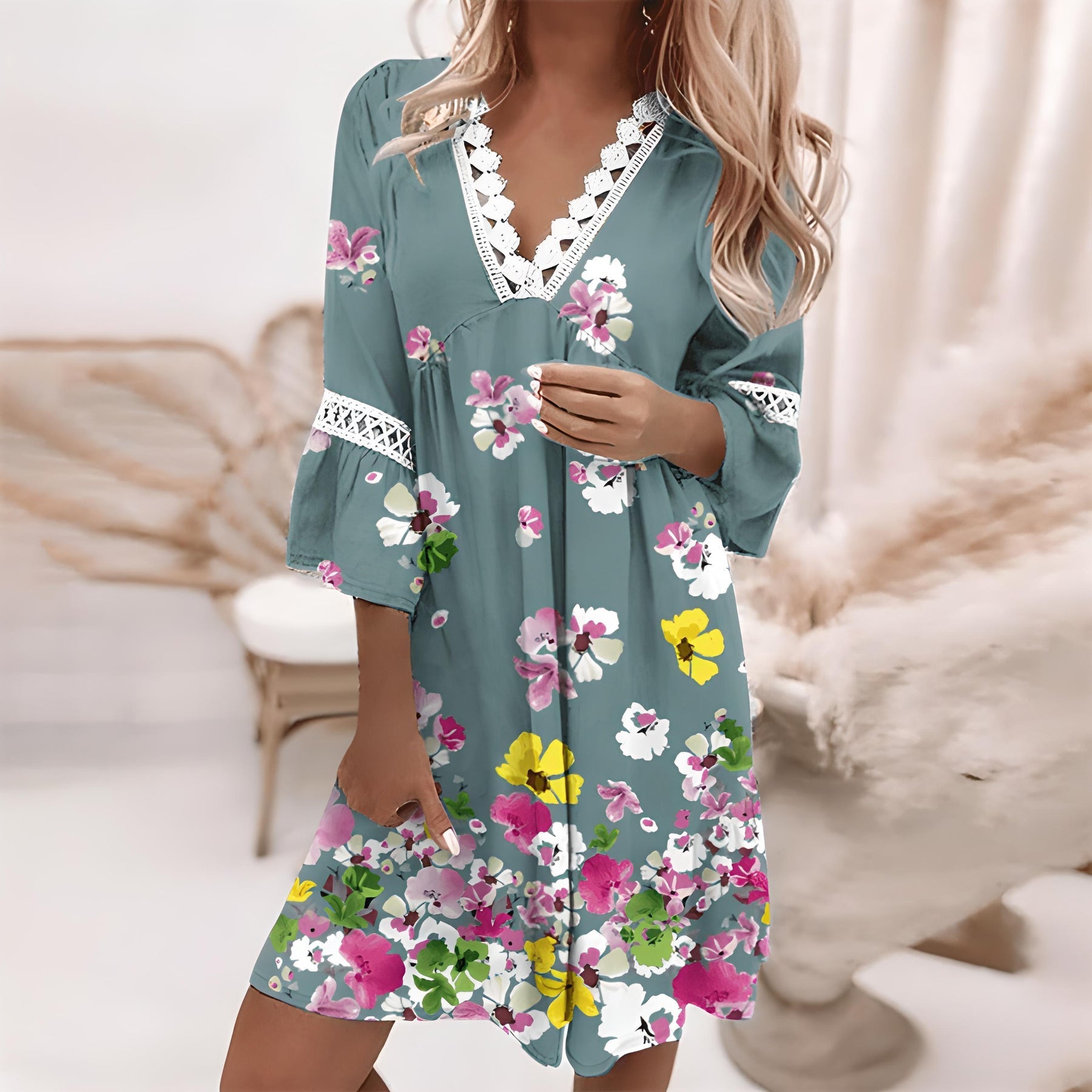 Mini dress for women – Flowy cut – Lace V-neck – Elegant flared 3/4 sleeves