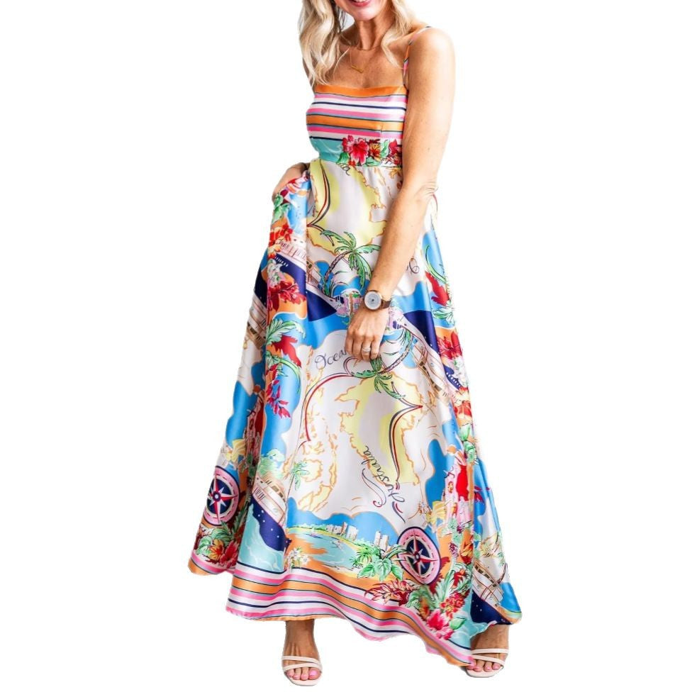 Women's long dress – Flowing cut – High waist – Thin straps – Elegant print